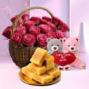 This gift combo includes: - 15 Red Roses Basket Arrangement - Mysore Pak (500 Gms) - Twin Teddy This charming gift combo radiates love and warmth, featuring a stunning basket arrangement of 15 vibrant red roses that symbolize deep affection and admiration. The lush red roses, artfully arranged in a basket, create an unforgettable display of elegance and romance, perfect for special occasions like anniversaries, Valentines Day, or heartfelt celebrations. Complementing this floral beauty is 500 gms of rich Mysore Pak, a traditional South Indian sweet with a smooth, buttery texture and a hint of cardamom. To add an extra touch of sweetness, the combo includes a pair of adorable twin teddies, making this the perfect gift for expressing love, joy, and cherished moments. This delightful package is sure to fill your loved ones heart with happiness and sweetness.