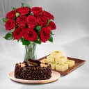 This gift combo includes: - 12 Red Roses in Glass Vase - Kalakand (500 Gms) - Chocolate Cake (1 Lb) This exquisite gift combo includes 12 radiant red roses arranged in a glass vase, symbolizing love and admiration. Accompanying the roses is 500 grams of Kalakand, a classic Indian sweet known for its creamy texture, and a decadent 1-pound chocolate cake. The combination of fresh, fragrant roses with the indulgence of Kalakand and chocolate cake makes this combo an ideal gift for special occasions like anniversaries, birthdays, or romantic celebrations. It’s a complete package of beauty, sweetness, and love, guaranteed to create cherished memories.