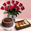 This gift combo includes: - 12 Red Roses in Glass Vase - Assorted Sweets (500g) - Chocolate Cake (1 Lb) This luxurious gift combo brings together the classic beauty of 12 red roses in a glass vase with 500 grams of assorted sweets and a 1-pound chocolate cake. The red roses, elegantly arranged in a glass vase, symbolize love and passion, making them a timeless gift for romantic occasions, anniversaries, or special celebrations. Accompanying the stunning roses is a box of assorted sweets, offering a delightful variety of traditional Indian confections that cater to every taste. To add an extra touch of indulgence, this combo also includes a rich, moist chocolate cake that is sure to satisfy any sweet tooth. This combination of flowers, sweets, and cake is the perfect way to celebrate love, milestones, or simply to make someone feel cherished and appreciated.