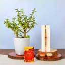 This is a gift combo of: - One Rudraksh Rakhi (RUDRK2443) - Jade Plant with Pot - Complimentary Roli Chawal N Tika - A Free Message Card is also included This thoughtful Raksha Bandhan gift combo features a sacred Rudraksh Rakhi (RUDRK2443) paired with a Jade Plant in a contemporary pot. The Rakhi, crafted with the revered Rudraksh bead, offers divine protection and well-being, while the Jade Plant stands for luck, harmony, and new beginnings. Together, they make a gift that radiates care, tradition, and positivity. The set also includes complimentary Roli, Chawal, and Tika for the rituals, plus a free message card to pen down your emotions and make the occasion extra special.
