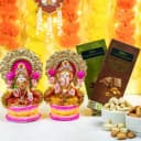 This gift set includes: - Handcrafted Pair of Clay Laxmi Ganesh Murti - Cadbury Temptations Rum N Raisins (72g) - Cadbury Temptations Almond Treat (72g) - Almond (100g) - Cashew (100g) Indulge in the beauty and joy of giving with our stunning Clay Laxmi Ganesh Murti gift set. Each handcrafted piece radiates blessings of wealth and energy, an ideal addition to any home. Partnered with two irresistible flavors from Cadbury Temptations chocolates—Rum N Raisins and Almond Treat—this set satisfies your sweet cravings while adding a touch of elegance. To round out the experience, enjoy 200g of crunchy almonds and cashews that are perfect for sharing or snacking. Great for gifting on special occasions or simply to brighten someone’s day, this set beautifully combines spirituality and deliciousness in one lovely package.
