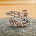 The Serpent's Embrace Silver Ring by Nimoraa captures the allure of serpentine beauty with its unique design that gracefully wraps around the finger. Adorned with exquisite fine-cut stones, its elegant curves create a mesmerizing sparkle at every twist and turn. Crafted with premium silver plating, this ring offers a modern aesthetic that is both stunning and versatile. With intricate details depicting serpent heads, it tells a story of elegance and artistry, making it a perfect addition to any jewelry collection—whether for everyday wear or special occasions.