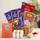 Celebrate the cherished ties of sibling love with our exquisite Rakhi and sweet delight package. Imagine the joy as your loved ones receive a carefully curated set that blends tradition with flavor. Featuring two masterfully designed Rakhis, this Raksha Bandhan becomes a moment to remember. Add to the joy with a delectable selection of Cadbury chocolate bars—Roasted Almonds, Crackle, and Fruit & Nut—offering a taste of luxury. Complete the treat with 1kg of soft Rasgulla from top brands like Haldiram or Bikano, paired with a savory 200g of crispy Haldiram Bhujiya. Each element comes beautifully arranged in a charming basket, complemented with Roli Tilak and Chawal to honor the age-old traditions.