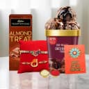 This Raksha Bandhan, celebrate the cherished bond with the Sibling Love Delight gift set. Featuring two uniquely designed fancy rakhis that embody the spirit of togetherness, this collection will warm hearts. Enjoy a generous 170g Kwality Walls Chocolate Ice-cream tub that melts in your mouth, paired with a delectable 70g Cadbury Temptation Chocolate Bar. To add a traditional touch, receive a complimentary Roli tika, Chawal, and a heartfelt Rakhi message card.