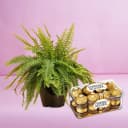 Elevate your gifting experience with the elegant Fern Plant, beautifully presented in a modern plastic pot. Standing between 3 to 7 inches, this vibrant indoor plant not only enhances any space but also contributes to your well-being by improving air quality. Accompanied by an exquisite 16-piece box of Ferrero Rocher chocolates, this gift is a splendid way to express your love or appreciation. Whether for a special occasion or just because, this charming combination leaves a memorable impact.
