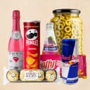 Create a beautiful world for your loved ones on Christmas by sending this Sparkling Christmas Hamper wrapped up in the essence of your love and warm feelings. This enticing Hamper incorporates 1 pack of Waffy Wafers (3 pcs), 1 Can of Red Bull, 4 pcs Ferrero Rocher Chocolates, 1 Bottle of Fiesta Fruit Juice (275 ml), a pack of Pringle Chips, 1 Bottle of Basil Seed Drinks (Redgrape flavor) and Canned Green Sliced Olives in a Glass Jar.