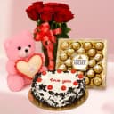 Send this Stunning Combo of 12 Red Roses in a Vase, Heart Shape Black Forest Cake, Pink Teddy n Ferrero Rocher Chocolates to your beloved one as a gift and show your affection. This flowers gift combo contains: Details: No. of Flowers: 12 Type of Flowers: Roses with Fillers decoration Flower Color: Red Type of Arrangement: In Transparent Glass Vase Type of Cake: Black Forest Cake with Love You topping Topping on Cake: Love You Shape of Cake: Heart Shape Weight: 1kg Type of Chocolates: Ferrero Rocher No. of Chocolate: 24pc Color of Teddy: Pink Size of Teddy: 12 Inch.