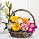 Pamper your loved ones by sending them this Stunning Mixed Flowers Basket exclusively meant to convey your wishes in the best manner. Product Details: Flowers: 3 Yellow Gerberas, 3 White Carnations, 1 Yellow Lilies Stem (1*3 buds/flowers), 3 Orange Roses, 2 Pink Roses and 3 Stems of Purple Orchids Gift Type: A Wicker Basket Arrangement