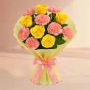 Embrace the joy of nature with the Sunny Blossom Bouquet! This vibrant arrangement features 12 radiant yellow roses paired with 12 charming pink carnations, creating a breathtaking display that brightens any room. Perfect for celebrations or just to spread cheer, this bouquet is a true embodiment of love and affection. Let the bold colors and fragrant blooms convey your warmest sentiments and delight your friends and family.