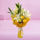 Illuminate every event with the Sunshine Celebration Bouquet, a charming arrangement that brings warmth and joy to any gathering. Featuring 18 bright yellow roses paired with two graceful white lilies, this bouquet effortlessly combines cheerfulness and elegance. It's the perfect gift for anniversaries, birthdays, or simply to brighten someone's spirit. Each bouquet is lovingly hand-tied, creating a stunning display of nature's vibrant beauty. Let this radiant composition fill your loved ones' hearts with happiness and unforgettable memories.