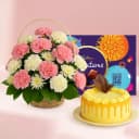 Merge your love as you send online this Superb Combo of Mixed Flowers Basket, Butterscotch Cake n Chocolates and send it to your dearest ones. This flowers n cake gift combo include: Details:</br) No. of Flowers: 20 Type of Flowers: Assorted (Pink Rose, Pink Carnations and Daisies) Flower Color: Pink n White Type of Arrangement: Basket Type of Cake: Butter Scotch Cake Shape of Cake: Round Weight: ½ kg Type of Chocolate: Cadbury Celebrations Weight: 215g Best Suited For: 20th Birthday, Mothers Day, House Warming, Wife N more.