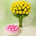 Send this Superb Yellow N Pink Gift Platter comprising of Yellow Roses in Vase n Pink Strawberry Cake. This flowers N cake combo include: Details: No. of Flowers: 36 Type of Flowers: Roses Flower Color: Yellow Type: In Vase Type of Cake: Strawberry Cake Shape of Cake: Round Weight: 1kg.
