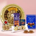 Paint a smile on the faces of the closest people in your life by sending this Sweet Pleasure Festive Gift Hamper that carries the essence of the feelings for them straight from your heart. This Diwali Gift pairing includes: 1. A Sweets Assortment Platter that holds Kaju Choco Ball (4pc), Kaju Butter Scotch Ball (4pc), Kaju Katori (4pc), Khajur Dry Fruit Laddoo (4pc), Sattoo Ladoo (1pc) and Kesaria Peda (6pc). 2. 3 pc Ferrero Rocher 3. Cadbury Dairy Milk Roast Almond Chocolate Bar (36 gm) 4. 2pcs Fancy Diya 5. Happy Diwali Fridge Magnet (Handmade, MDF Board, 3x3 in) 6. Ganesh Laxmi Mandap 7. A Free Diwali Card