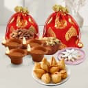 his Diwali Gift Box has: - Cashew In Designer Potli - 100 gms - Almond In Designer Potli - 100 gms - Kaju Katli -200gms - Mini Samosa - 200gms - 4 Pcs LED Light Water Sensor Diyas This festive season, send a gift combo of Sweet Serenity, Nutty Nobility: Diwali Euphoria for your family n friends and make them feel happy. T