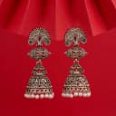 Embrace heritage with these elegant oxidised silver jhumkas. Crafted with precision, these temple-inspired earrings showcase intricate motifs and the eye-catching mix of green and maroon stones. The lovely pearl accents flowing from the jhumkas elevate their charm, making them ideal for festive occasions. A statement piece for the modern-day woman, these earrings effortlessly blend tradition with style. Style Tip: Pair them with both traditional attires and modern outfits to create a stunning ensemble.