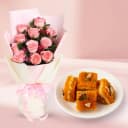 Toothsome Moti Pak from Gangotree Sweets and Snacks with Pink Roses Bouquet