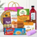 Indulge your brother with our Ultimate Relaxation Gift Set! This hamper is curated to provide him with a delightful blend of rejuvenation and comfort. Included in the set are Biotique Bio Honey Gel Face Wash, Organic India Tulsi Ginger Turmeric tea, crunchy Rostaa almonds and cashews, revitalizing Alo Vera juice, tasty McVities cookies, exquisite Omani dates, a plush face towel, an elegant pooja thali, and a stylish gift bag. This thoughtful assortment is ideal for expressing your heartfelt wishes for his well-being and joy.
