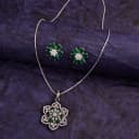 Discover the timeless beauty of this verdant charm pendant and earring duo, featuring glimmering American Diamonds. The nature-inspired motif elegantly showcases vibrant emerald stones that evoke the essence of spring blossoms. Suspended from a slender silver chain, the pendant pairs flawlessly with the coordinating stud earrings, making this set a versatile choice for any occasion. Whether dressing up for a gala or adding flair to everyday wear, this exquisite set elevates your look with effortless sophistication.