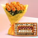 This gift combo includes: - 15 Orange Roses Tissue Wrappd Bouquet - Assortd Dry Fruits Sweets (500 Gms) This vibrant gift combo brings together the bright beauty of 15 orange roses, elegantly wrapped in tissue, with the indulgence of 500g of assorted dry fruit sweets. The stunning orange roses symbolize enthusiasm, passion, and warmth, making them perfect for expressing admiration and bringing a lively, energetic vibe to any occasion. Their radiant hue adds a touch of sophistication, making the bouquet ideal for celebrations, festivals, or heartfelt gestures. Paired with the roses is a selection of dry fruit sweets, offering a delicious blend of rich flavors and textures, crafted from premium ingredients like cashews, almonds, and pistachios. This combination of natures beauty and gourmet indulgence makes for a perfect gift, whether for a loved one, a friend, or a colleague, bringing joy and sweetness to their special day.