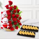 This gift combo includes: - 15 Red Roses Basket Arrangement - Chandrapuli (10 Pcs) - Twin Teddies This charming gift combo includes a basket arrangement of 15 red roses, beautifully arranged to convey love and affection. The vibrant blooms are perfect for romantic occasions or expressing heartfelt feelings. Paired with the roses are 10 pieces of Chandrapuli, a delicious Bengali sweet, and a pair of twin teddies that add a touch of cuddly charm. This delightful combination of stunning flowers, sweet treats, and adorable plush toys makes for a perfect gift to celebrate love and companionship.