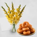 This gift combo includes: - 10 Yellow Gladiolus in a Glass Vase - Badusha (500 Gms) This stunning gift combo features 10 radiant yellow gladiolus elegantly arranged in a chic glass vase, symbolizing joy and positivity. The tall, striking blooms add a cheerful touch to any space, making them an ideal gift for celebrations such as birthdays, housewarmings, or simply to brighten someones day. Complementing the floral beauty is 500 grams of Badusha, a traditional Indian sweet known for its crisp exterior and luscious filling. This thoughtful combination perfectly balances the beauty of nature with delightful flavors, creating a memorable gifting experience that conveys heartfelt wishes and good cheer.