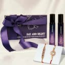 This gift box includes: - Set of 2 Designer Rakhis - Rivona Day and Night Perfume Gift set of 2 (15 ml each) Unveil a new level of luxury with the Rakhi Special Day and Night Perfume Gift Set. This curated set presents the perfect duo for the scent lover. The Day perfume shines with zesty, refreshing notes that add a spark of joy to your daytime adventures. Transitioning to the Night perfume, feel the allure and sophistication wrap around you like a warm embrace, creating a stunning contrast that turns heads. Expertly packaged in an elegant purple box, this gift set is a beautiful choice for any special event or personal treat. Elevate your daily fragrance rituals and express yourself with a delightful combination of day and night bliss.