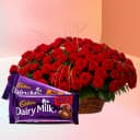 Alluring Gift of 50 Red Roses Basket with Cadbury Dairy Milk Silk