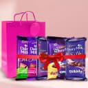Gift this Cadbury Dairy Milk Collection to those who deserve your love and let it act as the ideal token of your gratitude for them. This delectable pack consists of some unique varieties such as Dairy Milk Silk (Caramello-58 gms), Dairy Milk Silk (Fruit N Nut-60 gm), Dairy Milk Silk (Roast Almonds-60 gm), Dairy Milk Silk (Bubbly-65 gm) and Dairy Milk Silk (Oreo-60 gm), all put together in a Red Handbag that has been tied with a Red Satin Ribbon.