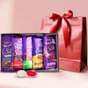 Gift this Cadbury Dairy Milk Collection to those who deserve your love and let it act as the ideal token of your gratitude for them. This delectable pack consists of some unique varieties such as Dairy Milk Silk (Mocha Caramello-58 gms), Dairy Milk Silk (Fruit N Nut-60 gm), Dairy Milk Silk (Roast Almonds-60 gm), Dairy Milk Silk (Bubbly-65 gm) and Dairy Milk Silk (Oreo-60 gm), all put together in a Red Handbag that has been tied with a Red Satin Ribbon.