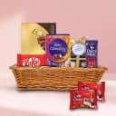 This gift basket has: - Cadbury Mini Celebration Pack (64.2 gm) - 16 pcs Ferrero Rocher Moments (69.6 gm) - 2 pcs Lotte Chocopie - 6 pcs Pineapple Flavoured Handmade Chocolate - Cadbury Dairy Milk Fruit N Nut Bar (36 gm) - Nestle KitKat (37.5 gm) - Cane Basket This thoughtfully arranged basket is filled with delightful treats that promise to bring a smile with every bite. It includes a Cadbury Mini Celebration Pack (64.2 gm) and 16 pcs of Ferrero Rocher Moments (69.6 gm) for that irresistible chocolate crunch. Lotte Chocopie (2 pcs) adds a soft and gooey texture, while 6 pcs of Pineapple Flavoured Handmade Chocolates introduce a fruity twist to the collection. The Cadbury Dairy Milk Fruit N Nut Bar (36 gm) and Nestle KitKat (37.5 gm) provide classic chocolate indulgence. All these sweet treasures come neatly placed in a reusable cane basket, perfect for gifting or sharing.