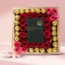 Convey all your sweet wishes through this gift of Amazing Valentine Gift of Ferrero Rocher Chocolates, Club Nuit Perfume n Roses for Fiancee and show your fondness towards the recipient on this Valentines Day. This special tray has - a) 16pc Ferrero Rocher b) Club Nuit Perfume for Women (100ml) c) Decorated with 6 Pink N 20 Red Artifical Roses d) In a Wooden Tray