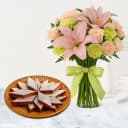 Shop Anjeer Katli (500 Gms) from Mithas Delicious Sweets with a 8 Flowers Bouquet (Pink Lily, White Carnations N Pink Roses) to wish your loved ones on their special days. (Only Available at Pune)