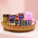 Deliver happiness by gifting this Array of Chocolate with Teddy Bear to your relatives and friends. This charming Basket comes with 5 pcs Heart Shape Homemade Assorted Chocolates, 6 inch Teddy, 18 pcs Homemade Assorted Chocolates, 4 pcs Ferrero Rocher Chocolates, Cadbury Small Celebration, 2 Pcs Temptation and Cadbury Ecliars (Small Packet).