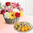 Assorted Dry Fruit Sweets from Adyar Ananda Bhawan with Mixed Flower Arrangement