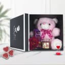 Add extra charm and sensation on Valentines Day with this gift of Astonishing Love Delight Gift Box having a Cute Teddy (24cm) with Cadbury Dairy Milk Silk Chocolate Bar (60g), Aroma Jar Candle from IRIS, a Love Timer n a Free Red Velvet Rose in a Just For You Premium Reusable Box and witness the heart of the recipient skip a beat after unwrapping it.