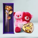 Conquer the hearts of your dear ones on Valentines Day with this Attractive Twin Body One Heart - A gift combo of 9in Couple Teddy of red n white colour holding a red Heart with a 3pcs Sapphire Hazelfills Chocolate Heart Shape Box N a Golden Rose and see the joy it brings to their life.