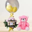 Win the hearts of your dear ones with this Awesome Arrangement of 4 Pink Roses, 16pcs Ferrero Rocher Chocolate and a Round Balloons in a Basket clubbed with a 6 inch Love Teddy and express your hearty love on this Valentines Day.