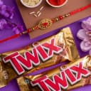 This is a gift of: - A Kundan Rakhi by Rakhi Sutra (PRRK8260) - 2 Pcs Twix (50g each) - Complimentary Roli Tika N Chawal - Complimentary Message Card with Free Rakhi Celebrate the special bond of Raksha Bandhan with a gift that blends elegance and indulgence. This set features a beautifully crafted Kundan Rakhi by Rakhi Sutra (PRRK8260), symbolizing tradition and heartfelt affection. Paired with 2 pieces of Twix (50g each), the chocolaty caramel delight adds a delicious twist to the festivities. The combo is complete with complimentary Roli Tika and Chawal for the sacred ritual and a message card to express your warm wishes, making this the perfect token of love for your brother.