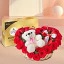 Bring people you love, closer to you by gifting them this Beautifying Teddy on Roses Heart Basket Arrangment with Ferrero Rocher Chocolates and strengthen the bond of the relationship you share with them on Valentines Day. This gift is made by adding a cute small Teddy to a Heart Shape made of 18 Red Roses on a basket and teamed with a 16pcs Ferrero Rocher Moments Chocolates to mark the moment of Propose Day