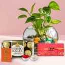 Celebrate the special bond with your bhai using our Bhai's Delightful Gift Set! This enchanting combination includes a vibrant Money Plant in a stylish glass bowl, symbolizing growth and abundance. To please his palate, indulge him with 16 delectable Ferrero Rocher chocolates. The duo of Rudraksha Rakhis adds a meaningful touch, offering blessings and protection. We also include complimentary Roli, Tika, and Chawal to complete this heartfelt tribute. It's the ideal gift to convey your love and make this Raksha Bandhan memorable.