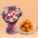 Elevate your special moments with this charming gift combination. Featuring 25 elegantly arranged red and white roses, this bouquet encapsulates the essence of love and togetherness. Each flower is handpicked to convey a message of appreciation and affection. Accompanying these stunning blooms are 500 grams of delightful Motichur Laddus, crafted to perfection. These traditional Indian sweets, made of light gram flour pearls, offer a heavenly taste experience. Perfect for anniversaries, festivals, or just to say thank you, this duo is set to create unforgettable memories that resonate.
