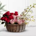 Brighten someone's day with our Blossoming Love and Beauty Basket, a delightful arrangement of nature's most stunning offerings. Featuring 13 radiant red roses that embody love, 7 joyful pink roses signifying admiration, and 5 graceful white orchids symbolizing purity, this basket is a true celebration of life. Ideal for birthdays, anniversaries, or simply to show you care, this charming gift exudes warmth and affection. Treat your loved ones to this captivating floral experience and make memories that last.