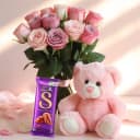 Surprise your special someone with the Blushing Rose Teddy Delight, a captivating gift that encapsulates love and warmth. This stunning arrangement features 15 delicate pink roses, creating a visual feast that radiates affection and beauty. Accompanying the blooms is a delightful 6-inch teddy bear, ready to cuddle and bring comfort. To add a whimsical touch, we've included a smooth Dairy Milk Silk chocolate bar, perfect for sweetening the moment. Ideal for any occasion—be it a romantic anniversary, a birthday celebration, or simply to say 'I care'—this charming ensemble promises to make memories that last a lifetime.