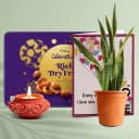 The Diwali Hamper consists of: - Diya - Cadbury Celebrations Rich Dry Fruits Collection Box 177g - Snake Plant with Pot - A Free Message Card Celebrate the Festival of Lights with our exquisite Cadbury Delights, Snake Plant Hamper. This carefully curated collection is designed to bring joy, prosperity, and elegance to your Diwali celebrations. The star of this hamper is the beautifully handcrafted Diya, a symbol of light and positivity. Light it up to illuminate your home and fill it with warmth and happiness. Indulge in the delicious Cadbury Celebrations Rich Dry Fruits Collection Box. With a delectable assortment of premium dry fruits covered in rich chocolate, this sweet treat is perfect for sharing and gifting. Enhance the aesthetic appeal of your home with the Snake Plant, known for its air-purifying properties and ability to bring good luck. This enduring plant comes with a stylish pot, adding a touch of elegance to any space. And as a special touch, we include a free message card, allowing you to express your heartfelt wishes and sentiments to your loved ones. Bring the spirit of Diwali into your home and delight your loved ones with this thoughtfully curated Cadbury Delights, Snake Plant Hamper. This is the perfect gift to convey your warm wishes and make this Diwali a truly memorable and joyous occasion.