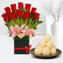 Send 20pc Canned Rossogolla from K.C.Das with a Designer Flower Arrangement for your dear ones. (Only Available at Kolkata)