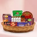See the glow on your family members face when you will deliver this Celebration Gifts Basket for Family and let him have a huge smile on this occasion. This Hamper includes- 1. Cadbury Chocobakes (75 gm), 2. Imported Walkars Short Butter Bread, 3. Haldirams Masala Mixture (200 gms), 4. Haldirams Moong Dal (200 gms), 5. Haldirams Kaju Katli (250 gm), 6. Haldirams Soan Papdi (200 gms), 7. Cadbury Dairy Milk Silk (75 gm), 8. Cadbury Temptation (75 gm), 9. Designer Pooja Thali 10. Cane Basket.