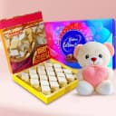 Surprise your loved ones with the Charming Badam Delight Gift Bundle! This exquisite set includes a generous 500-gram box of Tasty Bikanervalas Badam Katli paired with a cute 6-inch teddy bear and a Cadbury Celebration chocolate pack of 126 grams. Designed for any occasion—birthday, anniversary, or just to show you care—this delightful collection combines delectable flavors with huggable comfort. Make moments special with this exclusive gift available only in Ahmedabad.