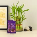 Elevate your gifting with this charming bamboo plant duo gracefully positioned in an elegant glass pot, accompanied by two sumptuous Cadbury Dairy Milk Silk chocolates. This thoughtful package not only symbolizes fortune through the lush foliage but also brings a touch of indulgence with its sweet delight. Ideal for birthdays, anniversaries, or just to brighten someone's day, this gift combines nature's beauty with gourmet treats for an unforgettable experience.