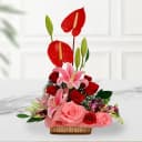 Immerse your senses in a bouquet that captures the essence of affection. The Charming Floral Affection Bouquet features six breathtaking roses, paired with two exquisite pink lilies showcasing their cascading petals, and three lively anthuriums that add a splash of vibrancy. This arrangement is more than just flowers; it's a token of love meant to uplift spirits and brighten any occasion. Ideal for celebrating cherished moments or simply to show you care, this striking ensemble radiates warmth and joy, inviting smiles with every glance.
