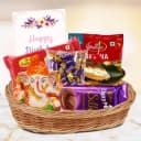 Surprise her with this Charming Gift Basket specially designed for her birthday! This delightful collection encapsulates the essence of your love and appreciation. Inside, she'll find authentic Haldiram Soan Papdi and Bhujia, satisfying her taste buds with traditional flavors. To enhance the experience, a beautifully crafted Paan Thali is included. The Ganesh Idol adds a touch of spiritual blessing, while the 2 Dairy Milk Silk bars and Eclairs chocolates combine for a sweet treat. Complete with a sincere Birthday Card, this hamper is perfect for expressing your heartfelt wishes on her special day. Each item is carefully selected to remind her how cherished she is, whether celebrating a birthday or any joyful occasion.